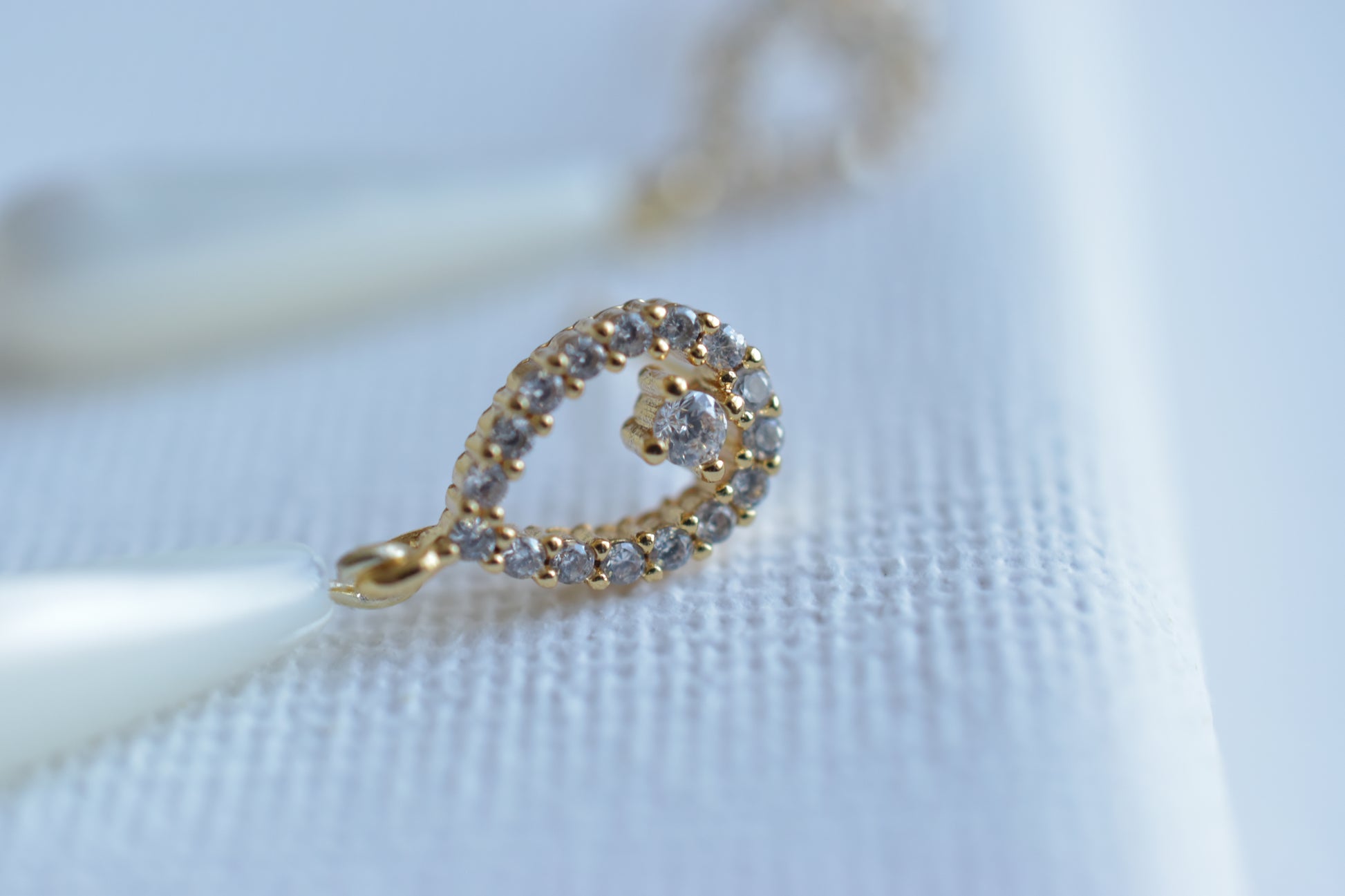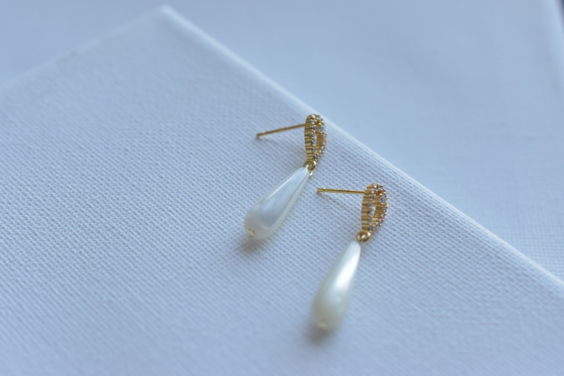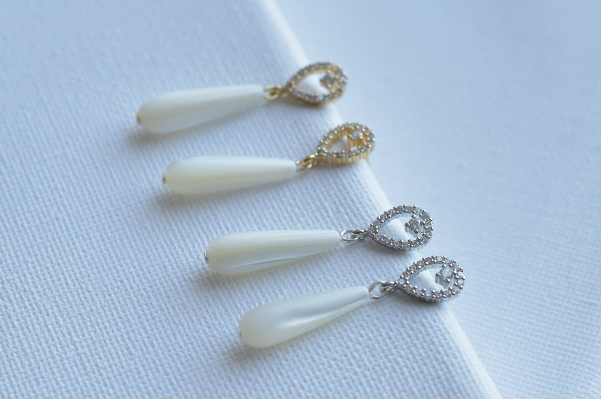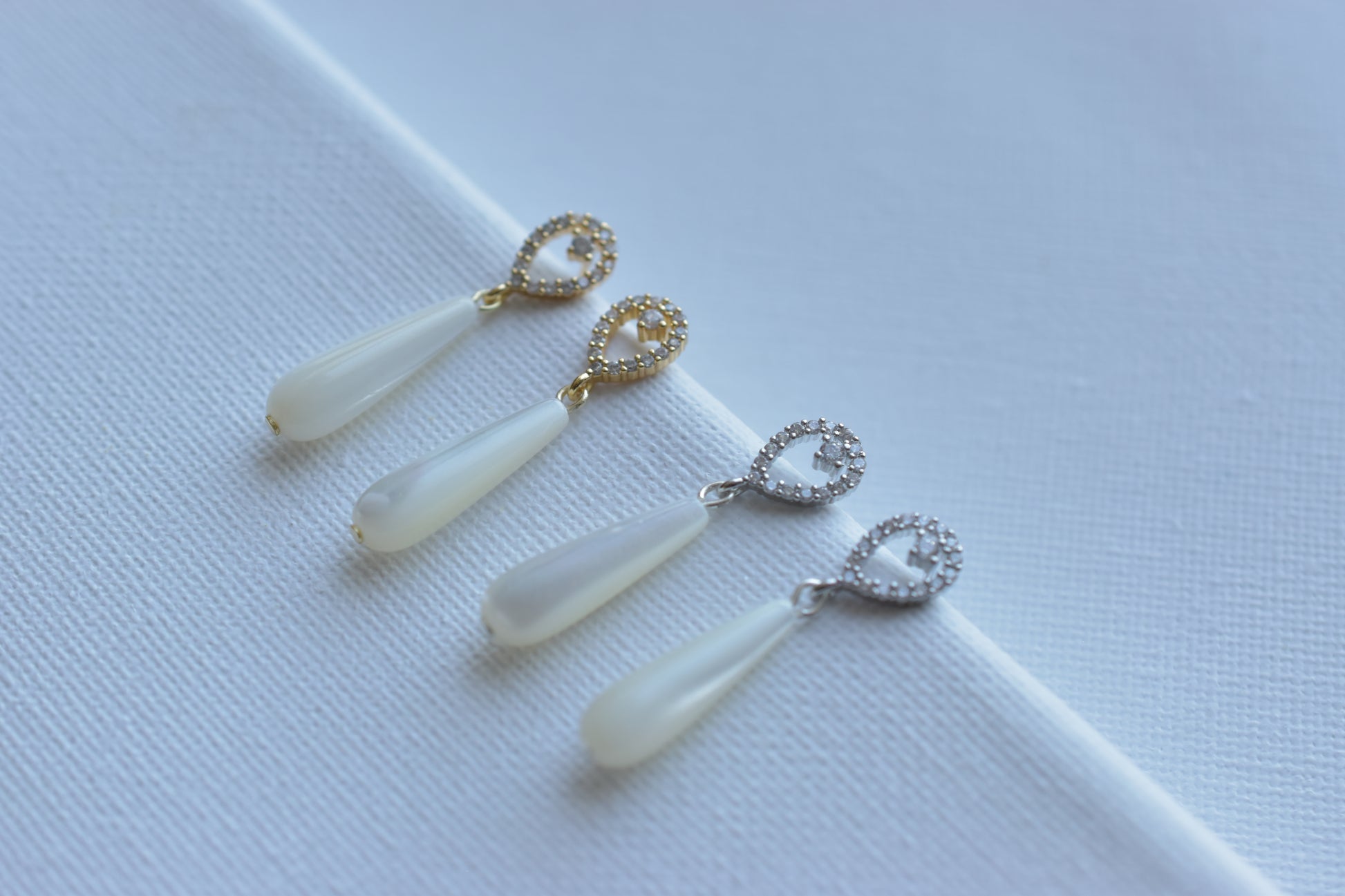 Teardrop crystal as focal point that sparkles with elegance, leading to a delicate water-drop pendant crafted from luminous mother of pearl. These earrings exude timeless beauty, offering a dainty yet striking accent perfect for any occasion.