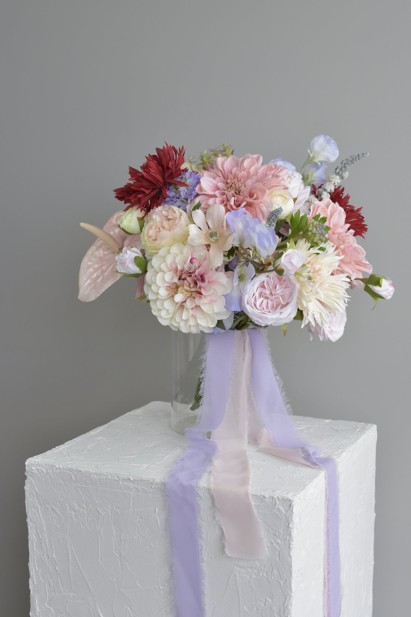 Inspired by the opulent elegance of the Victorian era, exudes an air of enchantment and grace. Soft shades of pink and purple intertwine with a touch of passionate red, evoking sentiments of love and devotion that linger in the air. Each delicate bloom is meticulously arranged to capture the essence of a bygone era, where love stories unfolded amidst grandeur and splendor. 'Romantic Muse' is the epitome of romance, a poetic symphony of colors that whispers sweet promises of forever, ensuring your wedding day is adorned with the magic of love.