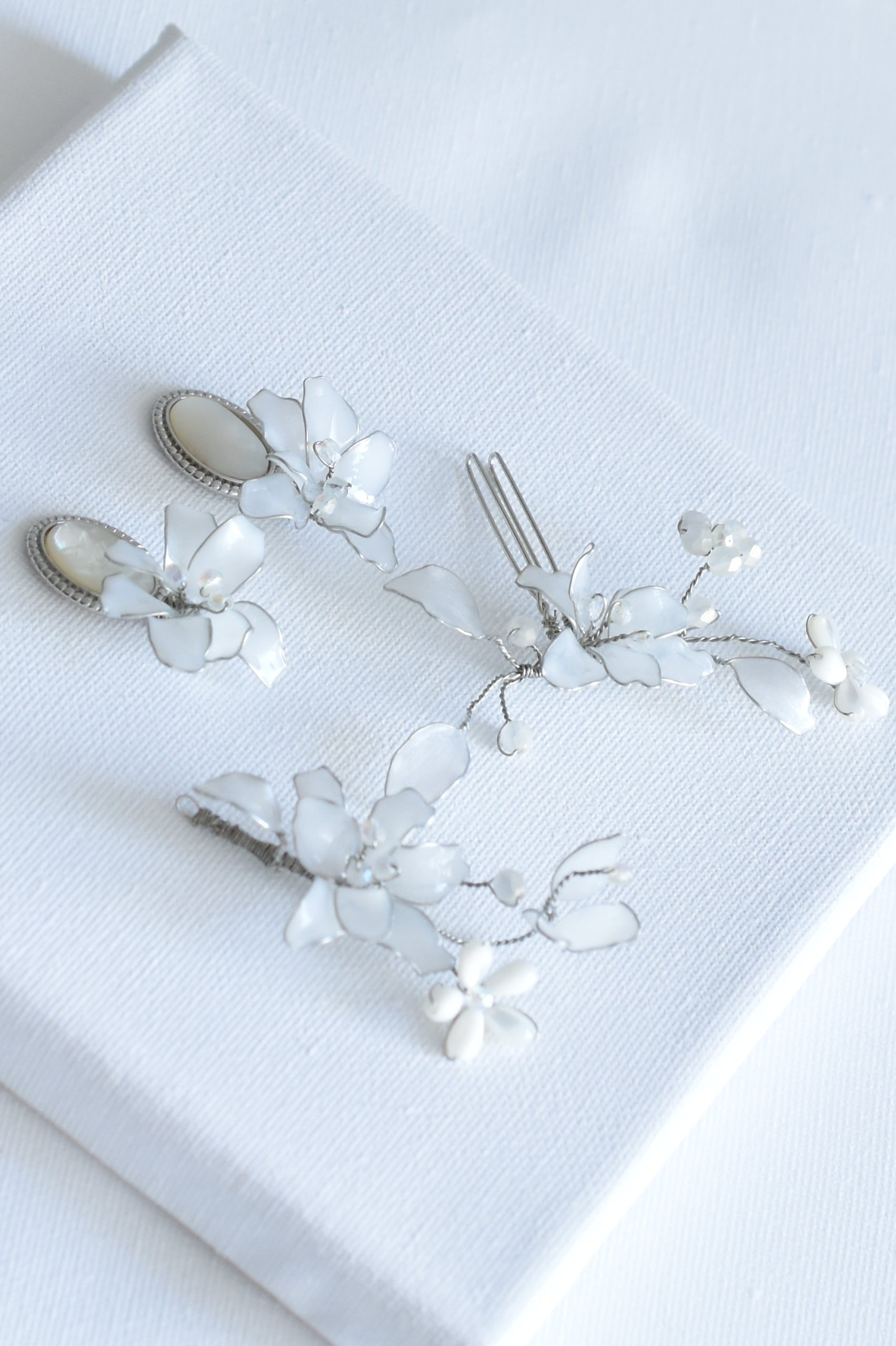 Inspired by the peaceful glow of a moonlit night, these delicate pins feature a harmonious blend of mother-of-pearl flowers and shimmering beads that exude elegance and sophistication. The dainty, chic design secures your hair effortlessly, adding a touch of whimsical charm to your bridal look.